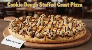 This dessert pizza features a golden, chewy crust filled with creamy cookie dough, creating a delightful contrast of textures. The base is topped with a rich vanilla glaze, a crown of crunchy salted pretzels, and luxuriously drizzled with melted chocolate and salted caramel. Serve this warm for melty bites or at room temperature for a deliciously sweet treat that balances salty, sweet, and chocolatey notes perfectly. Ideal for gatherings or satisfying late-night cravings, it’s a playful fusion of classic pizza and beloved treat flavors.